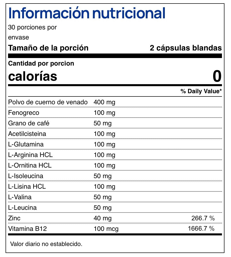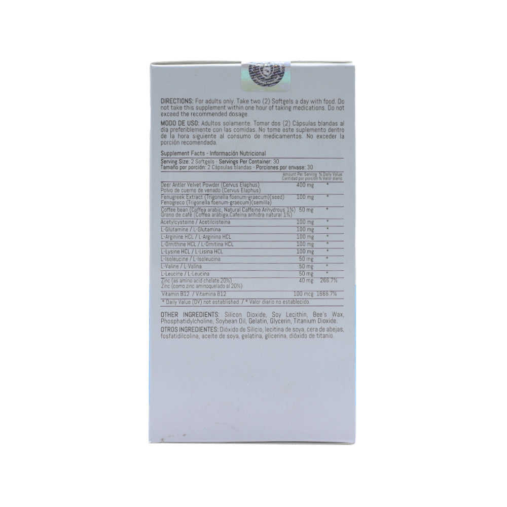 El polvo de cuerno de venado y el fenogreco presentes en la fórmula ayudan a estimular la producción natural de la hormona de crecimiento (HGH), lo que contribuye al desarrollo muscular y la regeneración celular.