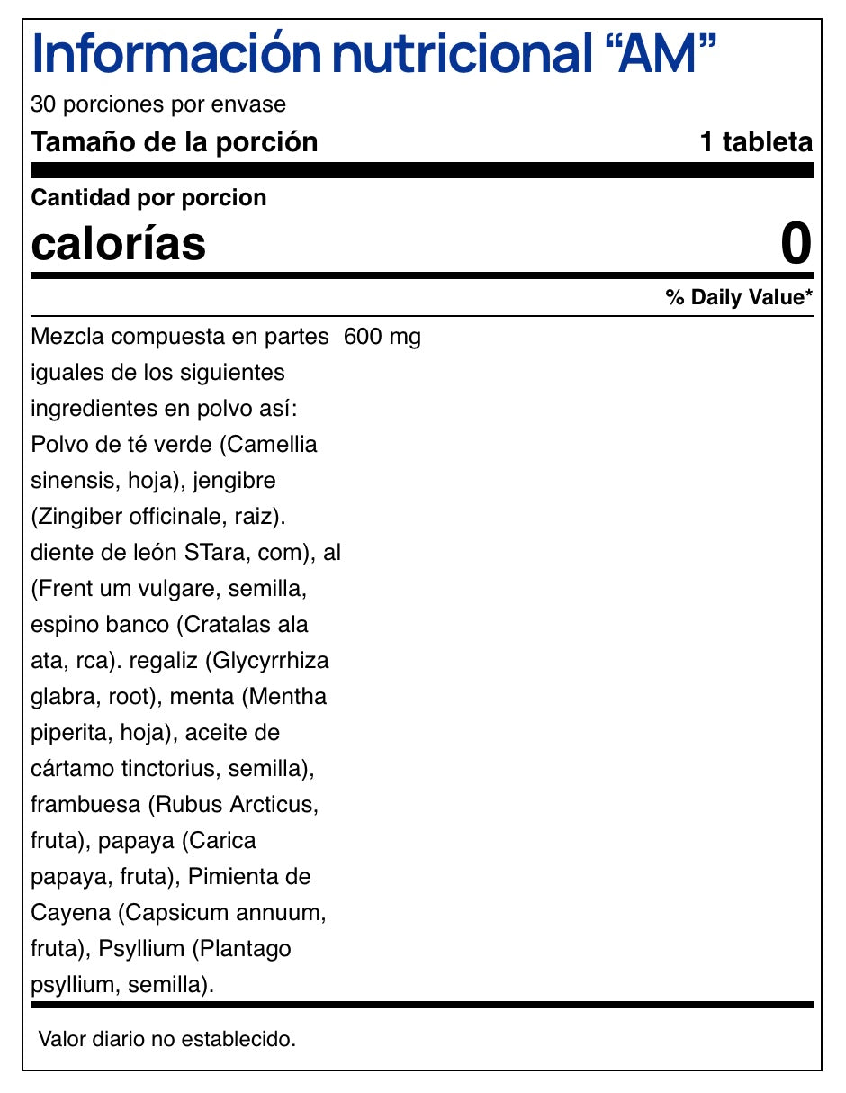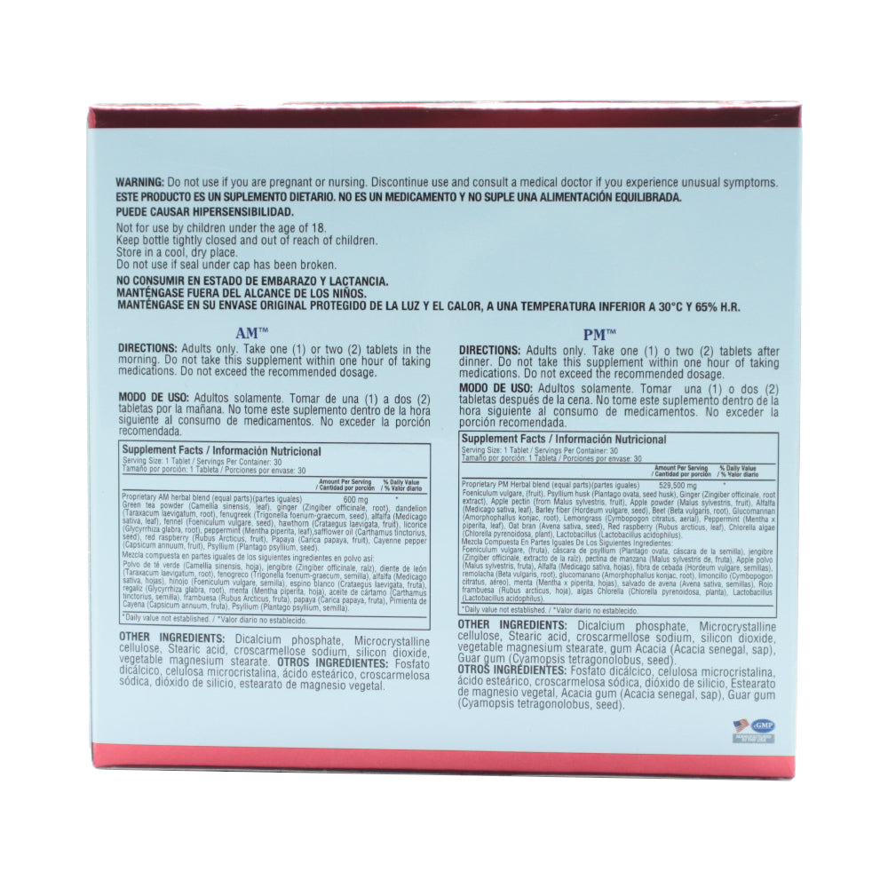 AM/PM es un suplemento en presentación de 2 frascos de 30 tabletas cada uno, diseñado para desintoxicar y purificar el cuerpo de forma integral. Sus beneficios incluyen la eliminación de toxinas de la sangre, el apoyo al sistema urinario y la desintoxicación del hígado, ayudando a mantener un metabolismo equilibrado. Además, regula los niveles de colesterol y azúcar, lo que contribuye a la salud cardiovascular. Gracias a su contenido de probióticos, también favorece la limpieza y reparación del intestino, promoviendo una digestión saludable y el control del peso.