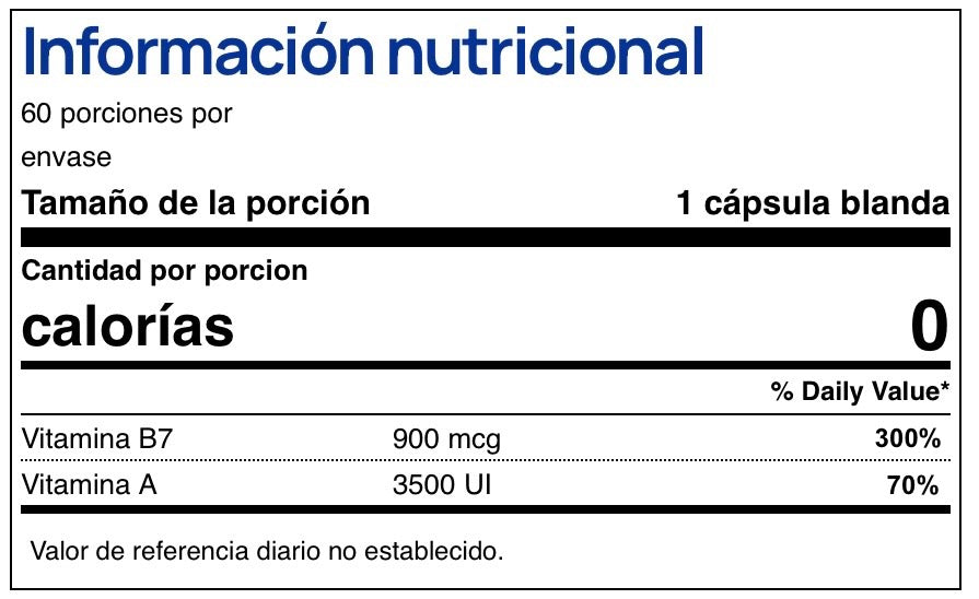 Ideal para quienes buscan un tratamiento completo contra la caída del cabello, este suplemento proporciona una dosis adecuada de biotina que estimula la regeneración y el fortalecimiento del cabello desde la raíz.
