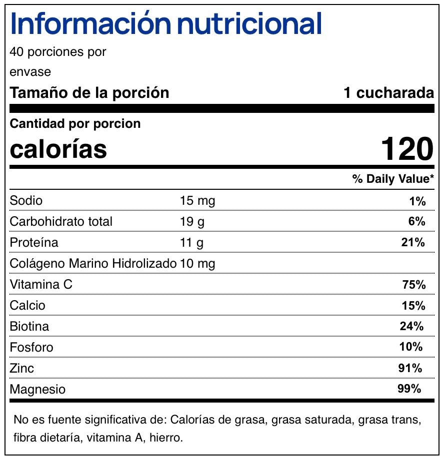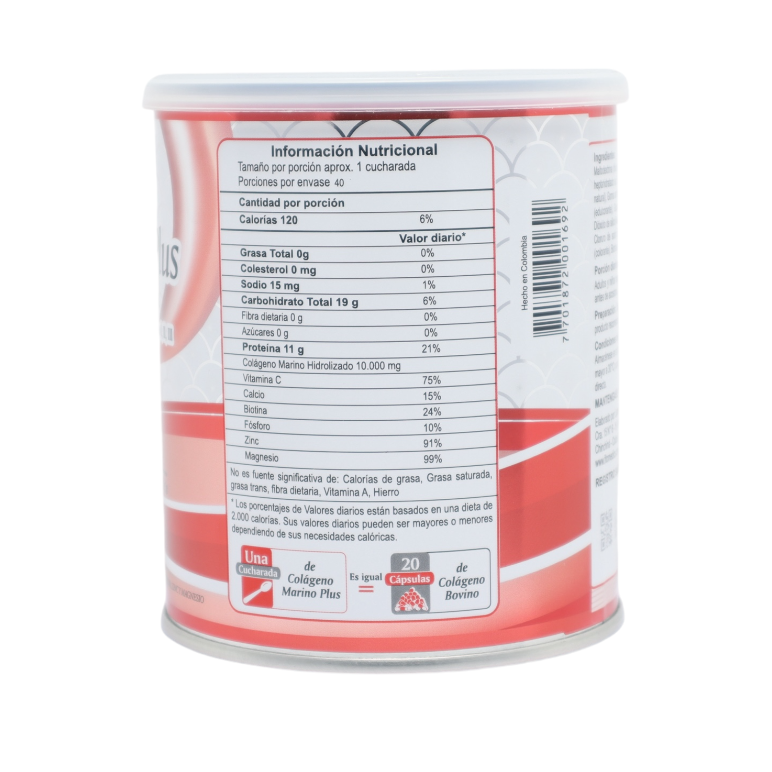 “Colágeno Marino Plus” es un suplemento ideal para quienes buscan fortalecer sus huesos y articulaciones, gracias a su contenido de colágeno marino que mejora la flexibilidad y la densidad ósea. La vitamina C incluida asegura una óptima absorción del colágeno, potenciando sus beneficios para la salud articular. Además, la biotina promueve una piel más elástica y reduce los signos de envejecimiento, mientras que el zinc contribuye a la regeneración celular y a una piel más suave. Por último, el magnesio ayuda a relajar los músculos, previniendo calambres y mejorando el bienestar general, especialmente para quienes llevan una vida activa.