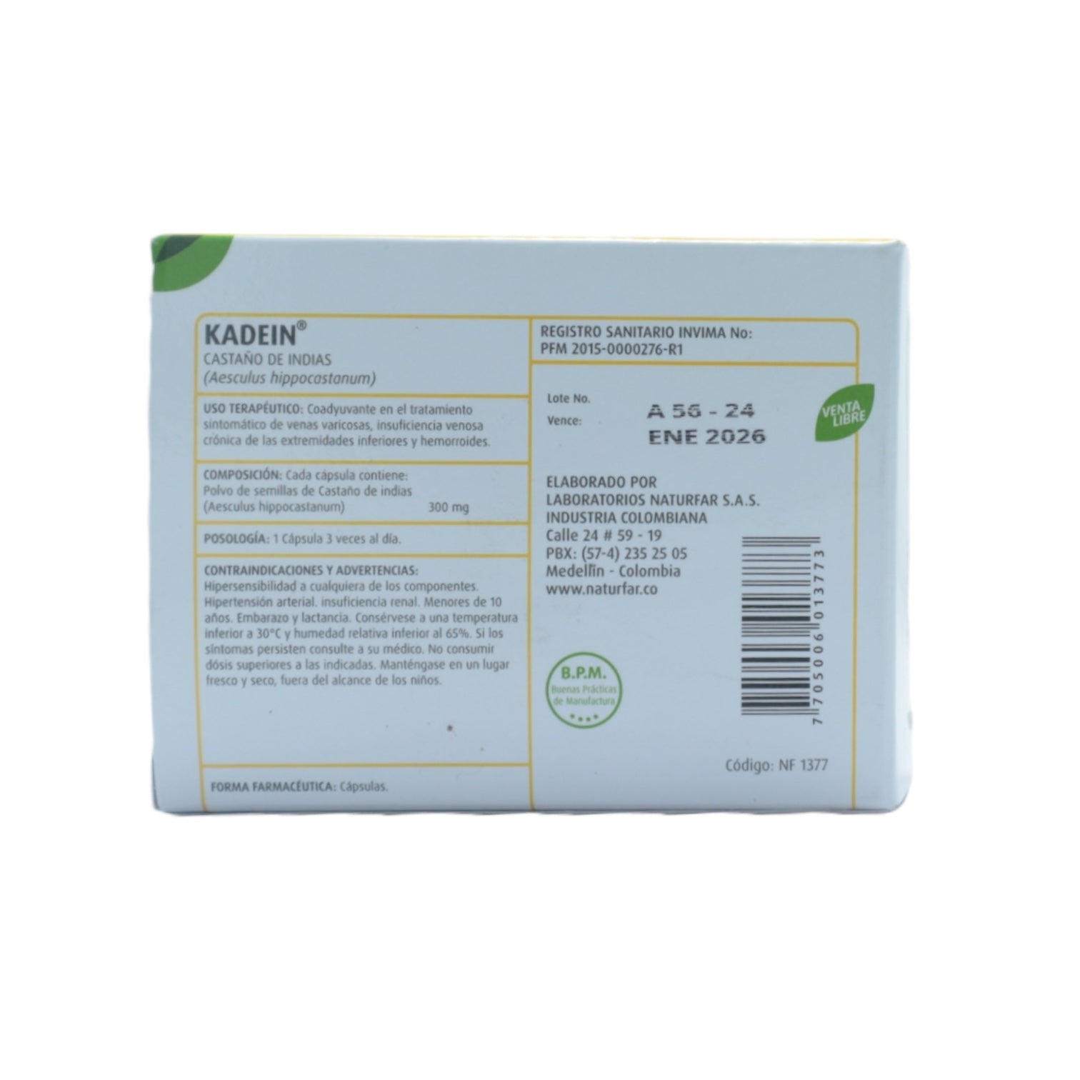 Kadein con Castaño de Indias es ideal para mejorar la salud venosa y aliviar molestias relacionadas con las venas varicosas y hemorroides. Su fórmula fortalece los vasos sanguíneos, mejora la circulación y reduce la inflamación, ayudando a minimizar la hinchazón y la acumulación de líquidos. Además, ofrece un alivio eficaz del dolor y la incomodidad, promoviendo el bienestar general y previniendo futuras complicaciones.