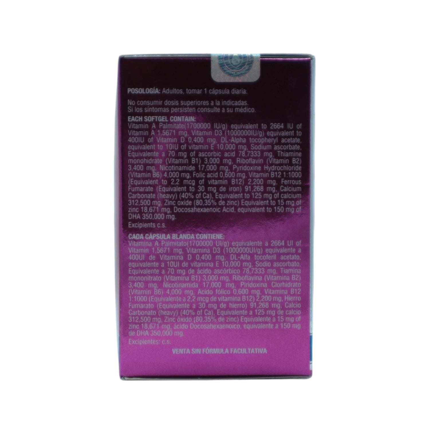 Vitamina A Palmitato (1700000 Ul/g) equivalente a 2664 Ul of Vitamin 1,5671 mg, Vitamina D3 (1000000Ul/g) equivalente a 400Ul de Vitamina D 0,400 mg, DL-Alfa tocoferil acetato, equivalente a 10Ul de vitamina E 10,000 mg, Sodio ascorbato, Equivalente a 70 mg de ácido ascórbico 78,7333 mg, Tiamina mononitrato (Vitamina B1) 3,000 mg, Riboflavina (Vitamina B2) 3.400 mg. Nicotinamida 17,000 mg, Pinidoxina cloridrato (Vitamin B6) 4,000 mg, Acido fólico 0,600 mg, Vitamina B12 1:1000 (Equivalente a 2,2 mcg de vitamina B12) 2,200 mg, Hierro Fumarato (Equivalente a 30 mg de hierro) 91,268 mg, Calcio Carbonato (heavy) (40% of Ca), Equivalente a 125 mg de calcio 312,500 mg, Zinc óxido (80,35% de zinc) Equivalente a 15 mg of zine 18,671 mg, ácido Docosahexaenoico, equivalente a 150 mg de DHA 350,000 mg.