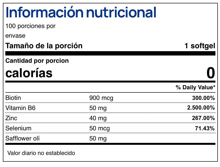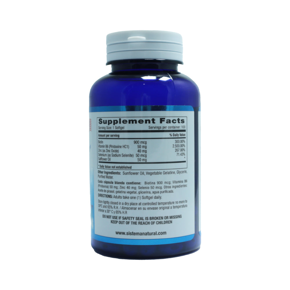 Este producto combina biotina, zinc, vitamina B6, selenio y aceite de cártamo para ofrecer un cuidado integral del cabello, las uñas y la piel. Estimula el crecimiento capilar, previene la caída del cabello y fortalece las uñas, mientras que nutre la piel, mejorando su apariencia. Además, su acción antioxidante protege contra el daño celular, manteniendo una apariencia joven y saludable.