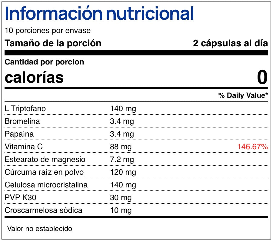 Reutaquin combina componentes como cúrcuma, L-triptófano, bromelina, papaina y vitamina C, ofreciendo un poderoso apoyo para la salud articular y ósea. Sus propiedades antiinflamatorias alivian el dolor articular, mientras que la vitamina C mejora la absorción de calcio para fortalecer los huesos. Además, optimiza la digestión y la absorción de nutrientes esenciales, fomenta el bienestar emocional al promover la relajación, y protege los tejidos frente al daño oxidativo gracias a su acción antioxidante.