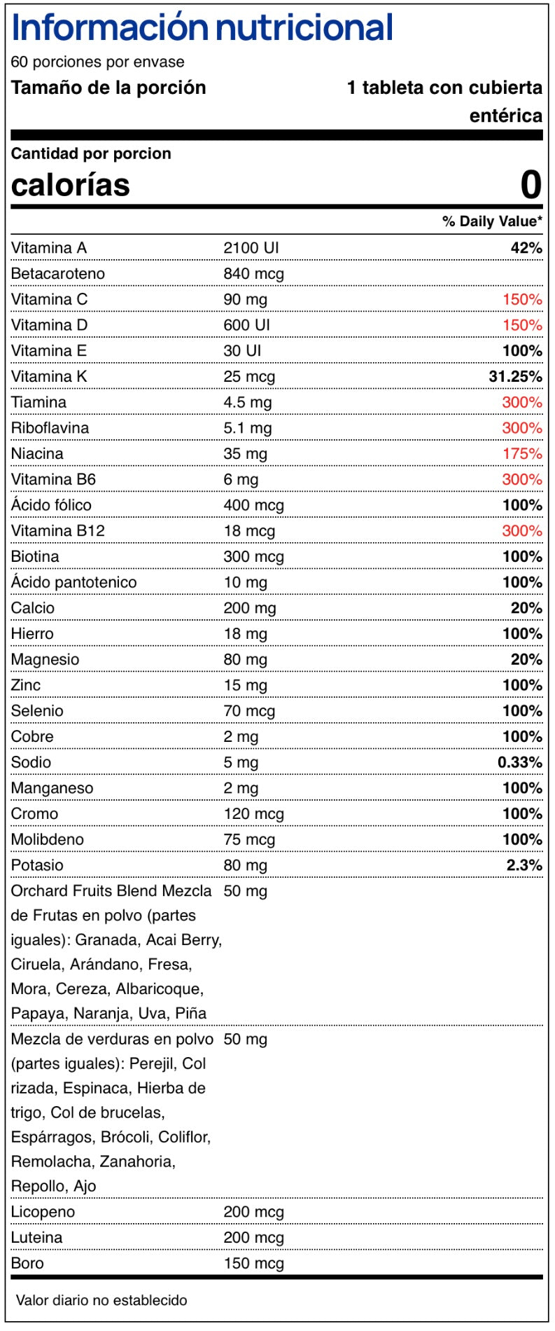 Este completo suplemento de vitaminas y minerales está diseñado para apoyar la salud integral de hombres y mujeres. Gracias a su combinación de nutrientes esenciales, fortalece el sistema inmunológico, promueve huesos y músculos fuertes, embellece la piel, el cabello y las uñas, aporta energía y vitalidad, y protege la salud cardiovascular. Una fórmula ideal para quienes buscan bienestar y energía en su día a día.