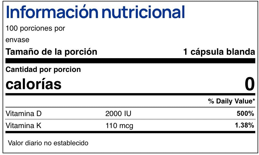 La combinación de vitamina D3 y K2 facilita la absorción de calcio y su adecuada distribución en los huesos, lo que ayuda a mantener una estructura ósea fuerte y saludable.